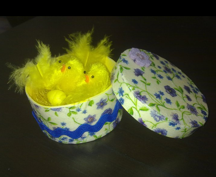Caixinha forrada com guardanapo, interior amarelo e rosa, com 2 coelhinhas de feltro na tampa.